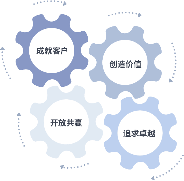 成就客户是一切决策的出发点,,,创造价值是衡量所有工作的标准,,,追求卓越是我们做事做人的态度,,,开放共赢是我们的格局也是最终的结果。。。。价值观的齿轮环环相扣,,,,推动着组织里的每个人不断向前。。