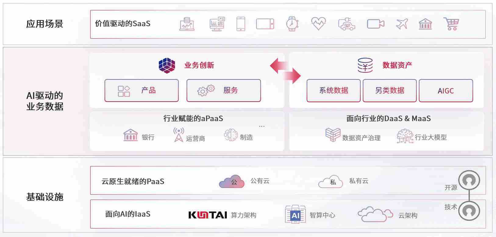 数字时代,,,围绕企业数字化转型的关键要素,,J9.COM数码开创性的提出数云融合战略和技术体系框架,,,着力在云原生、、、数字原生、、、AI原生和信创产业上架构产品和服务能力,,,为处在不同数字化转型阶段的快消零售、、、汽车、、金融、、、医疗、、政企、、教育、、运营商等行业客户提供泛在的敏捷IT能力和融合的数据驱动能力,,,构建跨界融合创新的数字业务场景和新业务模式,,助力企业级客户建立面向未来的核心能力和竞争优势,,,全面推动社会的数字化、、智能化转型升级。。